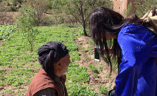 Walking among the ruins of the village was an emotional experience for me, filled with an intense feeling of connection and loss. Arriving at a place I had never been before, it still felt like a part of me. Witnessing the ruins, I could barely comprehend that this place, once full of life, was where my family lived. While in the ruins of the Mellah, I called my mother through FaceTime to show her the village of her childhood. I was excited to make this video and share the village with her, but I didn't consider how traumatic it would be for her to witness the ruins of what was once her home. After visiting the Mellah, a man from the village invited us to his home for tea. The grandmother was sitting outside, making wool thread with a stick, rolling the soft raw wool into a thin white thread wrapped around the stick into a bowl. I remembered a flash of memory about wool making in the village. I even remembered my mother demonstrating the same gesture of rolling the thread that I’m witnessing in front of me.